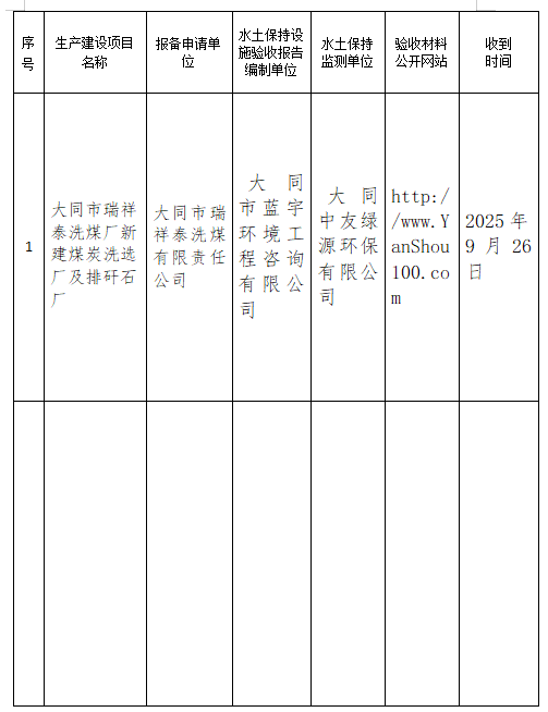 根据《中华人民共和国水土保持法》及生产建设项目水土保持设施自主验收管理的有关规定,2025年9月26日我局收到大同市瑞祥泰洗煤厂新建煤炭洗选厂及排矸石厂项目水土保持设施自主验收报备材料,现予以公示,公示期2025年9月28日—2025年10月10日。