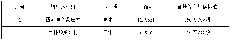 该宗地拟征收西韩岭乡冯庄村土地6.9859公顷,其中:农用地6.7527公顷(其中耕地1.3961公顷,其他草地0.6386公顷),建设用地0.2332公顷,未利用地0公顷;西韩岭乡北村土地11.6331公顷,其中:农用地10.9078公顷(其中耕地8.8899公顷、其他草地0.5886公顷),建设用地0.7253公顷,未利用地0公顷。