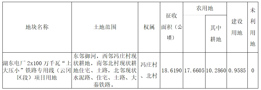 拟征收地块为湖东电厂2x100万千瓦“上大压小”铁路专用线(云冈区段)项目用地,涉征地块位于云冈区西韩岭乡冯庄村、北村,用地面积18.6190公顷。