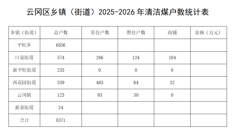 (二)型煤发放户数:经摸底统计,所涉乡镇街道现有燃煤户数为8371户,其中平旺乡为6856户;云冈镇为123户;西花园街道为559户;口泉街道为574户;新平旺街道为235户;新泉街道为24户。